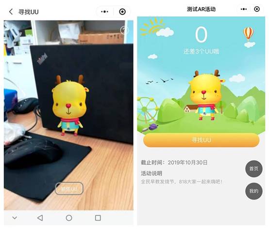 AR互动娱乐技术助力分店引流。小程序菜单栏附带的AR技术可以通过扫描全优加的LOGO,抓取品牌IP形象“UU”,若附近有UU可抓取,即可获得品牌派送的礼物,客户到指定分店体验或者领取礼物。整个过程利用了AI功能识别LOGO,然后通过LBS技术获取用户的具体位置,最后在AR实景中会出现UU,即可抓取。通过此套智能识别技术,为客户提供了互动性和可玩性,同时让品牌达到了线下引流的功能。同样使用过此类技术的一些优秀案例有支付宝扫福、口袋精灵游戏、百度地图抓生肖游戏等,均带动了全国上亿流量的参与。