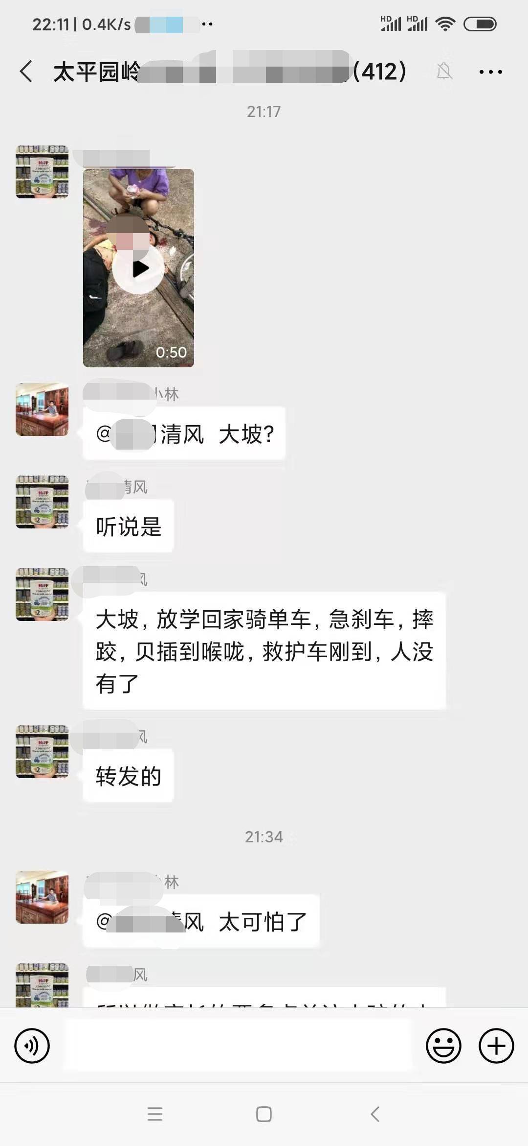 5月25日傍晚,有网友在群里发出视频,画面中一男孩摔倒在地,有一辆自行车也跌倒在一边,地上一大滩血,小孩的上身衣服也被鲜血渗透,画面令人悲痛,小孩已经一动不动···········