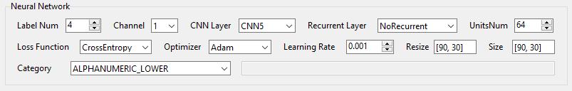 1. 神经网络区 的配置项看起来很多,对于新手来说,只需先选择好使用的网络,在样本配置区选择样本路径之后,会自动配置图片有关的参数,保持默认推荐参数即可。笔者一般使用 CNNX+GRU+CTC 网络进行不定长验证码的训练。