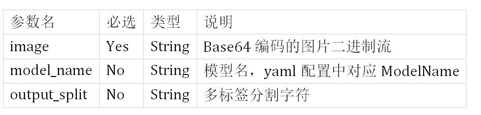 请求为 JSON 格式,形如:{image: iVBORw0KGgoAAAANSUhEUgAAAFoAAAAjCAIAAA...base64 编码后的图像二进制流}