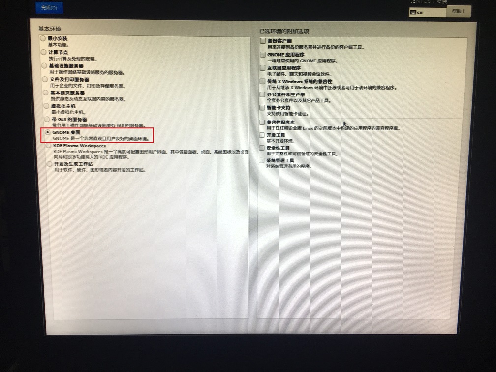 9.选择图20中的“软件选择(S)”,进入图21中选中“GNOME桌面”,点击“完成”(如图20,21所示);