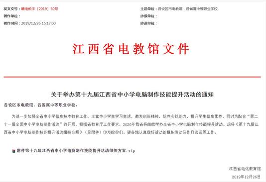 据了解,江西省电气教育馆在在去年底就对该活动下发了通知文件。按照电教馆要求,各学校选派1-2名担任信息技术课或者对此项工作有兴趣且责任心强的教师参加,以确保该活动能够有序组织和圆满举行。