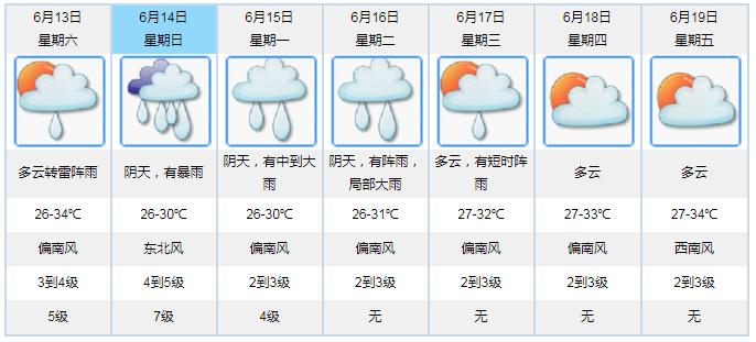 今天,多云到晴,气温26到35度,天气炎热,注意防暑降温。预计,13日多云转雷雨,局部地区雨势较大;14日有明显风雨影响;15-16日有阵雨局部大雨;17-19日转为多云天气。