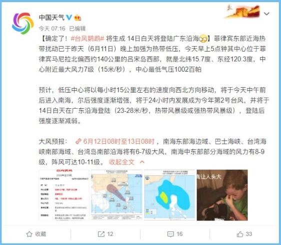今晨8时,热带低压中心位于菲律宾吕宋岛西部。预计,该热带低压将于12日中午前后进入南海,尔后强度逐渐增强,今天白天发展成为今年第2号台风,并将于14日白天以“热带风暴或强热带风暴”之姿登陆广东沿海。