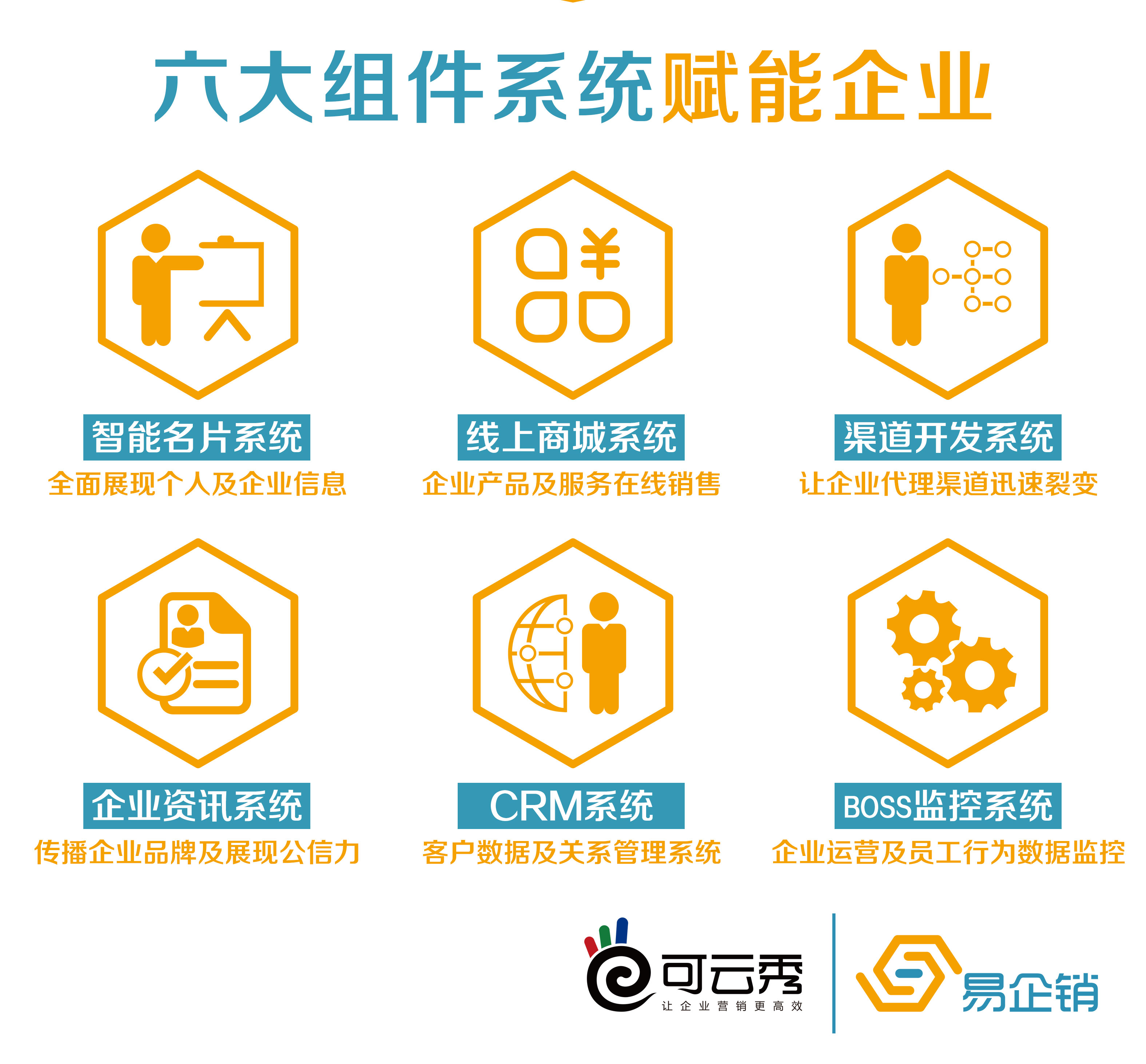 2018年底,可云秀上线了“易企销全员营销系统”小程序。其主要功能包括智能名片系统、线上商城系统、渠道开发系统、企业资讯系统、CRM系统、BOSS监控系统。囊括了目前主流的营销型系统功能,比如微信生态圈推广、智能分析管理、分销模式管理等。