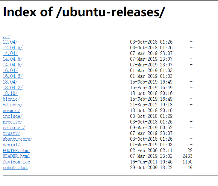 点击后面的http,进入会发现有很多看不懂的东西。没关系,大部分都不重要,你只用知道前面几个全是数字的文件是版本,我们选择18.04.2/。其实哪个都行但是不要太旧了,像之前的12就有点老。你问我为什么不选最新的?因为太新了我怕出问题嘛,不兼容或者崩溃啥的,其实也是可以的,哈哈。