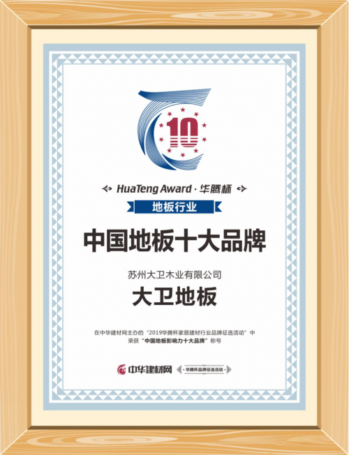 由中国家居建材行业综合门户“中华建材网”,倾力打造的首届“华腾杯”中国家居建材行业品牌征选活动于近日落下帷幕,大卫地板连获“中国地板影响力十大品牌”、“中国地暖地板十大品牌”两大奖项,这也是自2012年以来,大卫地板第8次获得十大品牌殊荣。首先要感谢中华建材网为我们企业搭建的平台,同时更要感谢消费者对大卫地板的认可。进取年,满意2019,大卫21岁,是32项标准主要起草单位,客户满意度是检验工作的唯一标准!大卫地板,用心创造精致家居!