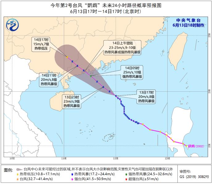 6月13日16时,台风“鹦鹉”中心位于我市沿海东南方约350公里的南海海面上,也就是北纬19.4度、东经115.2度,中心附近最大风力8级(20米/秒),中心最低气压995百帕。