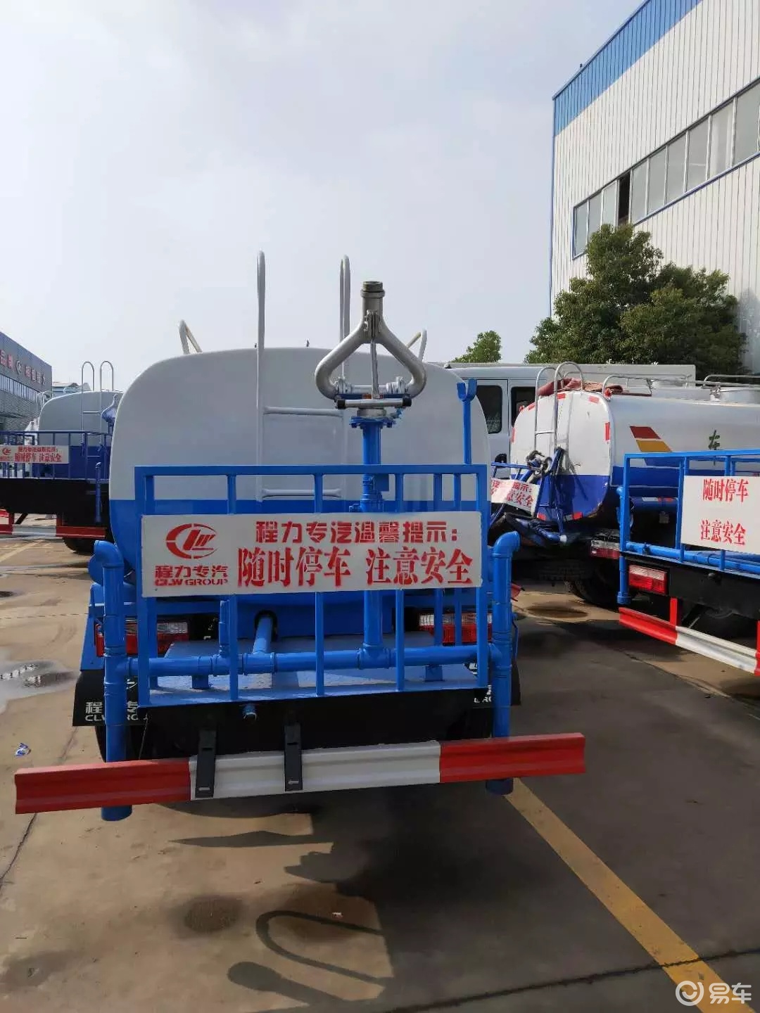 前封头带水位计,后平台主管路带1寸浇花接口,后爬梯。平台后部带小安全告知牌:“随时停车,注意安全”,带两根水管及阴阳端。罐体颜色:上白/下蓝,银灰/银蓝,罐体两侧喷“洒水车、绿化喷洒车”字样,贴反光标示。