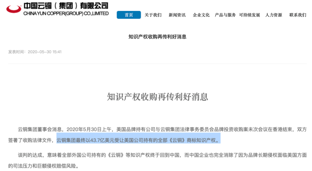 中国云铜的收购还没有完,它表示将决定收购其它企业持有的美国、欧盟、日本、韩国等《云铜》相关品牌系列标识及全部知识产权。