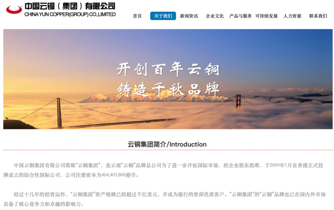 根据公司官网介绍,公司是云南“云铜”品牌总公司,为了进一步开拓国际市场,经企业股东批准,于2009年1月在中国香港正式挂牌成立的综合性国际公司,公司注册资本为4.04亿港元。经过十几年的经营运作,“云铜集团”资产规模已经超过千亿美元。