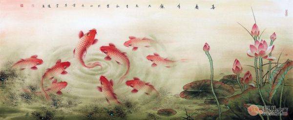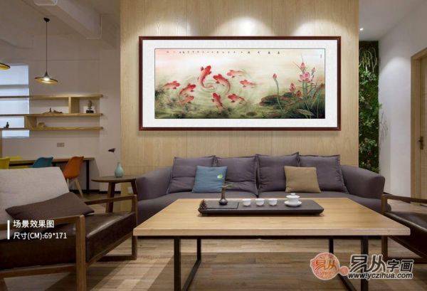 挂画的位置,要选在引人注目的开阔处,一些角落或是阴影处不宜悬挂。在家里挂的画首选要符合主人的喜好和需求,这幅经典的荷花九鱼图就是吉祥客厅挂画的典范,不仅能够为家中增添生机、活跃居室氛围,还能为家里烘托出高雅的艺术气息,美化家居环境。