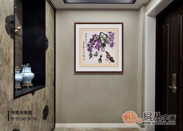 这幅作品的画家是齐白石后人朴喆老师,齐派艺术作品的收藏价值自然不必多说,挂在家里不仅有面子,同时也是一个会升值的潜力股。最重要的是这幅作品所包含的风水价值,紫藤象征着紫气东来,玄关挂一幅紫藤画能为家中引财,画中的三只小鸡,还有生生不息的吉祥富贵之意。而且这幅作品的尺寸不大不小,对于玄关来说也是刚好合适的,所以说,如果你还不知道玄关应该挂什么画,不妨就考虑这幅作品吧~