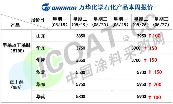 万华化学5月25日报价,甲基叔丁基醚山东地区上涨100元/吨至3900元/吨,华东、华南区域上涨150元/吨分别至3900元/吨,3700元/吨。正丁醇华北区域上涨150元 /吨至5700元/吨,华东区域上涨200元/吨至5950元/吨,华南地区上涨100元/吨至5900元/吨。