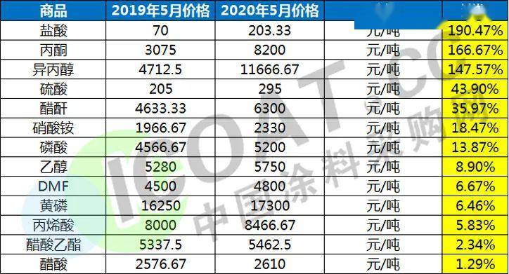 相较2019年5月同期数据,共有13种化工原材料价格出现涨势,其中排名前三位的是盐酸(190.47%),丙酮(166.67%),异丙醇(147.57%)。盐酸的价格由去年5月的70元/吨飙升至今年5月的203.33元/吨,涨幅几近翻倍。业内人士分析,根据以往情况来说,TDI、氯丙烯,环氧丙烷及甲烷氯化物所联产副产盐酸质量相对较好,副产酸对于盐酸市场的冲击较大。但就今年的情况来看,众多化工原材料下游需求端出现停滞,因此副产酸市场也受到了影响,盐酸也就得到了利好。