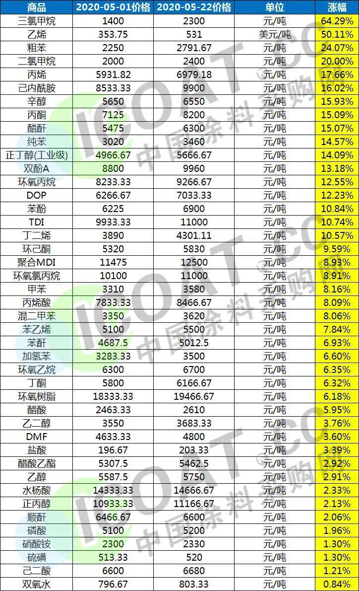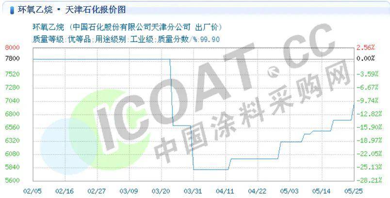 据涂料采购网了解,近期,受原油价格的持续波动,国内化工原材料价格出现了不同程度的上涨。5月25日,华北地区环氧乙烷出厂价格较22日原料乙烯在国际原油大幅反弹的利好支撑下,止跌上涨,再加上环氧乙烷区域装置停车检修,场内资源偏紧,看涨氛围浓厚。