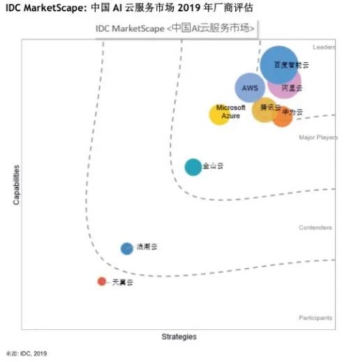 相比于阿里云的定义“云计算及人工智能公司”,百度云的定义是“智能云计算服务商”,智能排在云的前面,顾名思义百度云的差异化竞争就是AI能力。根据IDC的报告,百度智能云在AI服务的维度在中国排名第一。