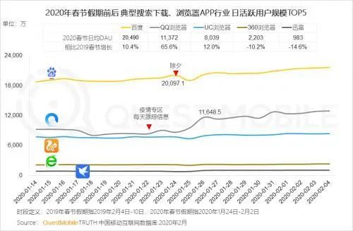 QM发布的报告也显示,百度App今年春节期间日活用户增长了10.4%,在搜索、浏览器类APP中百度依然占据最大的市场份额。