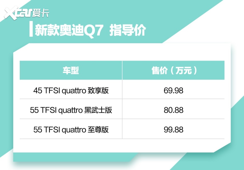 3月19日,新款奥迪Q7公布售价,共推出三款车型,售价区间为69.98-99.88万元。不过此次是奥迪官方针对配置的不同进行限量发售,三个配置分别限量577台、177台以及77台。预计后续还将有其他配置的车型上市,提供更多选择。