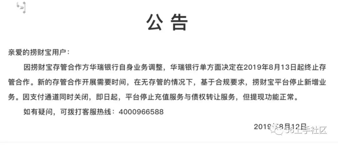 事实上,这则公告的问题很明显“华瑞银行单方面终止存管服务”。银行存管、支付通道的合作出于,审慎原则如果没有大问题也会给P2P平台缓冲期。而捞财宝的这则公告显然告诉我们:华瑞银行是当即决定。如果不是涉严重违规、重大业务风险或踩了监管红线,银行为何要坐失百万存管费呢?