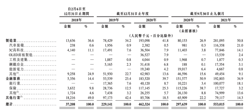 2018年至2021年9月30日,创新奇智分别有50名、150名、157名和130名客户。其中,金融服务业的客户数量从2018年的2名增至2020年的18名,2021年前三季度共12名。金融服务业客户在2018至2020年贡献的平均收入在279万元、330万元、1020万元,2021年前三季度则平均贡献1600万元,毛利率30.9%。