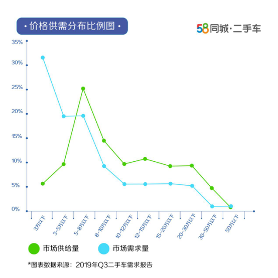 58同城报告指出,性价比仍是消费者选购二手车时最关注的要素。根据数据显示,第三季度5万元以下的二手车需求量达到51%,与第二季度基本持平。从市场供给来看,5万元以下二手车仍然存在较大缺口,其中,3万元以下二手车供给量为6%,3-5万元二手车供给量为10%,并不能满足市场需求量。低价位二手车供需之间的较大差距,反映出消费者对低价二手车的旺盛需求没有得到完全满足,高性价比的日常出行需要将是二手车市场的一大机遇。