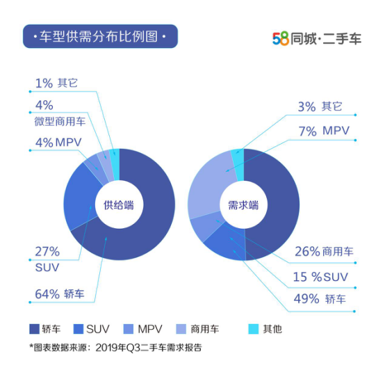 58同城报告显示,第三季度轿车的市场供给量占比64%、需求量占比49%。供给比上一季度提高,需求量也提高了3个百分点,轿车在供需两端占比仍然稳居第一,是最受消费者青睐的车型。相比第二季度,SUV的需求量提高了3个百分点,商用车需求在本季度继续高涨,从第二季度的24%上升到26%,排名第二,超越了SUV。报告认为,随着创业创新的发展,不少商家购置商用车拉货、载物、跑运输,使商用车的需求量有所提高。