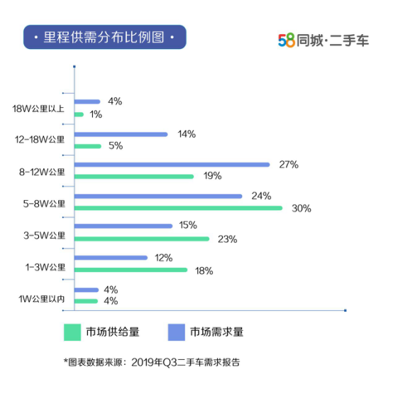 58同城报告,还对汽车行驶里程和排量等车况数据对消费者影响进行了统计,消费者明显青睐里程数居中的二手车。其中,5-8万里程二手车需求量为24%,8-12万里程二手车需求量为27%,占比高于其他里程二手车。而在车辆供给方面,5-8万里程二手车供给量最高,达到30%,能较好地满足市场需求。8-12万里程二手车供给量为19%。与车龄情况相似,中等里程的二手车价格更划算,而且磨损在可以接受的范围内,因此备受消费者欢迎。