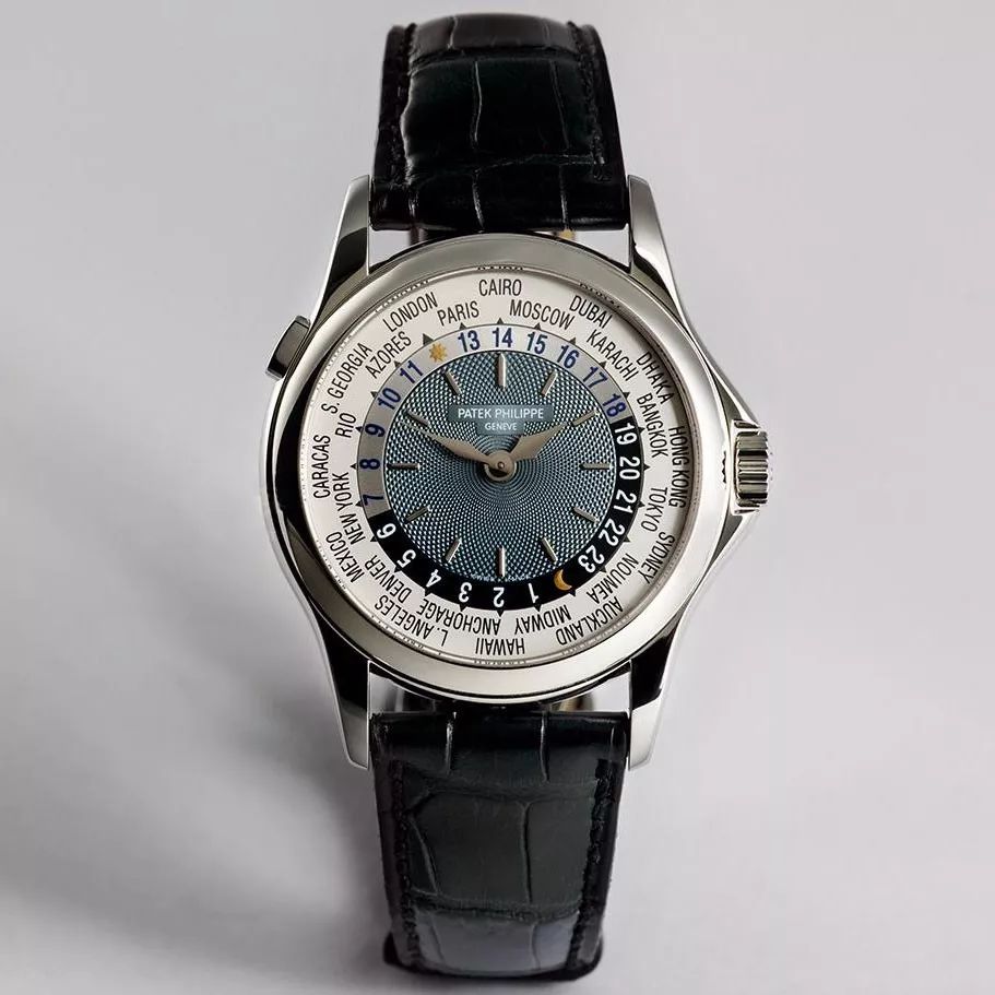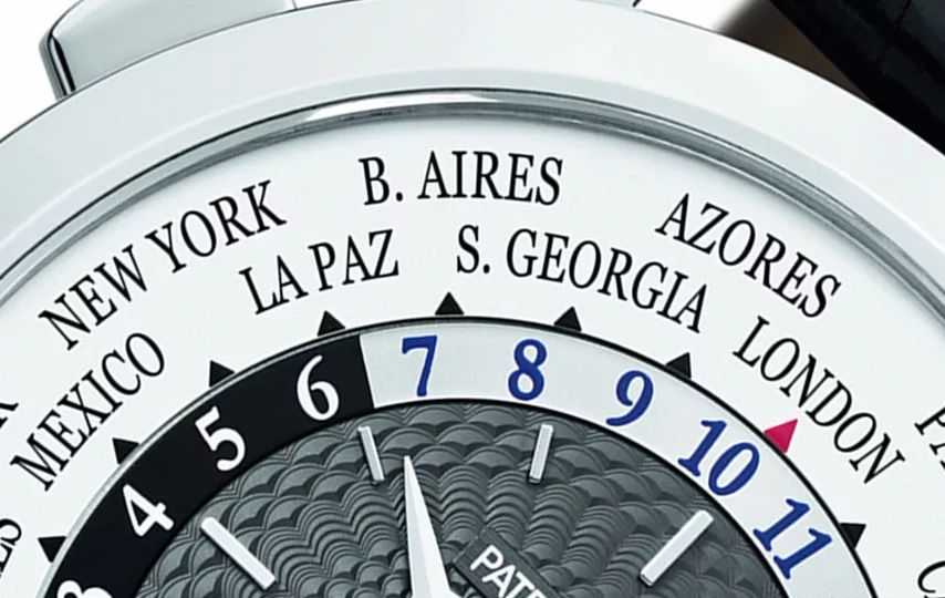 之后经过多次设计更改,比如出现了旋转表圈等。1999年时,百达翡丽获得快调时区装置的专利——按动10时位置的按钮,时针就会自动向前跳转,城市圆盘和24小时刻度环同时转动一格,分针走动完全不受影响。