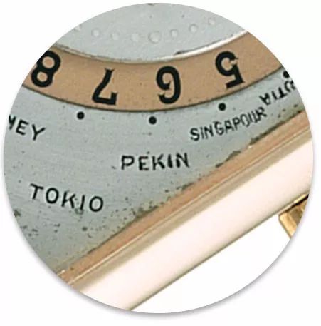 当时的设计理念是,只要表盘外缘有足够空间,就在不影响可读性的前提下提供尽可能多的城市信息,这个理念一直延续到20世纪50年代。当时的腕表上,一个时区可同时显示3个城市名,一枚腕表可显示多达40个地点。