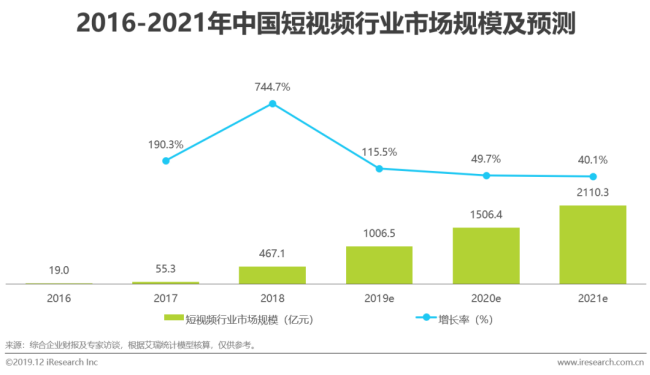 据艾瑞咨询发布的统计数据,短视频行业历经8年发展,目前已进入商业化的成熟期。在移动互联网红利期逐渐消退的时代,短视频依旧保持迅猛发展,用户流量与日俱增,几乎是唯一在增长的明星级应用领域。未来,随着短视频逐渐成为用户在线娱乐不可或缺的方式,短视频平台盈利空间空前,到2021年市场规模预计将超过两千亿。