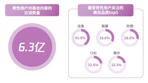 而在男女分布上,男性的内容消费数据似乎更值得关注。个护美妆、时尚好物中的高男性占比,展示出了男性对这些品类强烈的产品和服务需求。报告数据显示,男性用户对美妆内容的日消费量达到6.3亿,洁面、面膜、防晒都是男性用户关注的热点。在珠宝、腕表的品类中,男性用户的关注度同样不亚于女性。综合数据表明,他经济的发展已不容小觑。