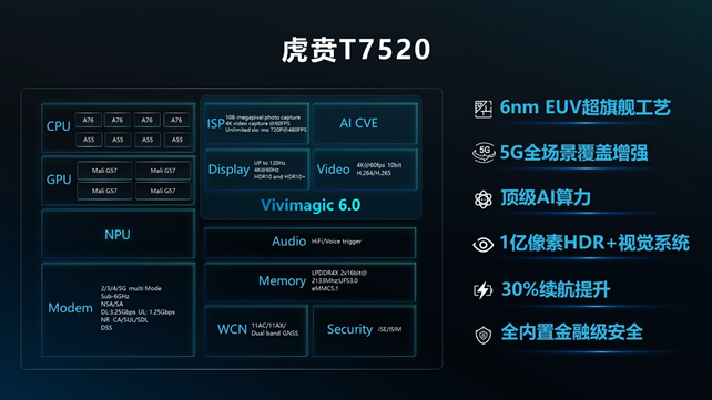 据悉,虎贲T7520 于今年2月26日发布,基于马卡鲁2.0平台,单芯片集成5G基带,采用了已量产最先进的6nm EUV工艺制造,拥有多层极紫外光刻技术加持,相比初代7nm晶体管密度提高18%,芯片功耗则可降低8%。