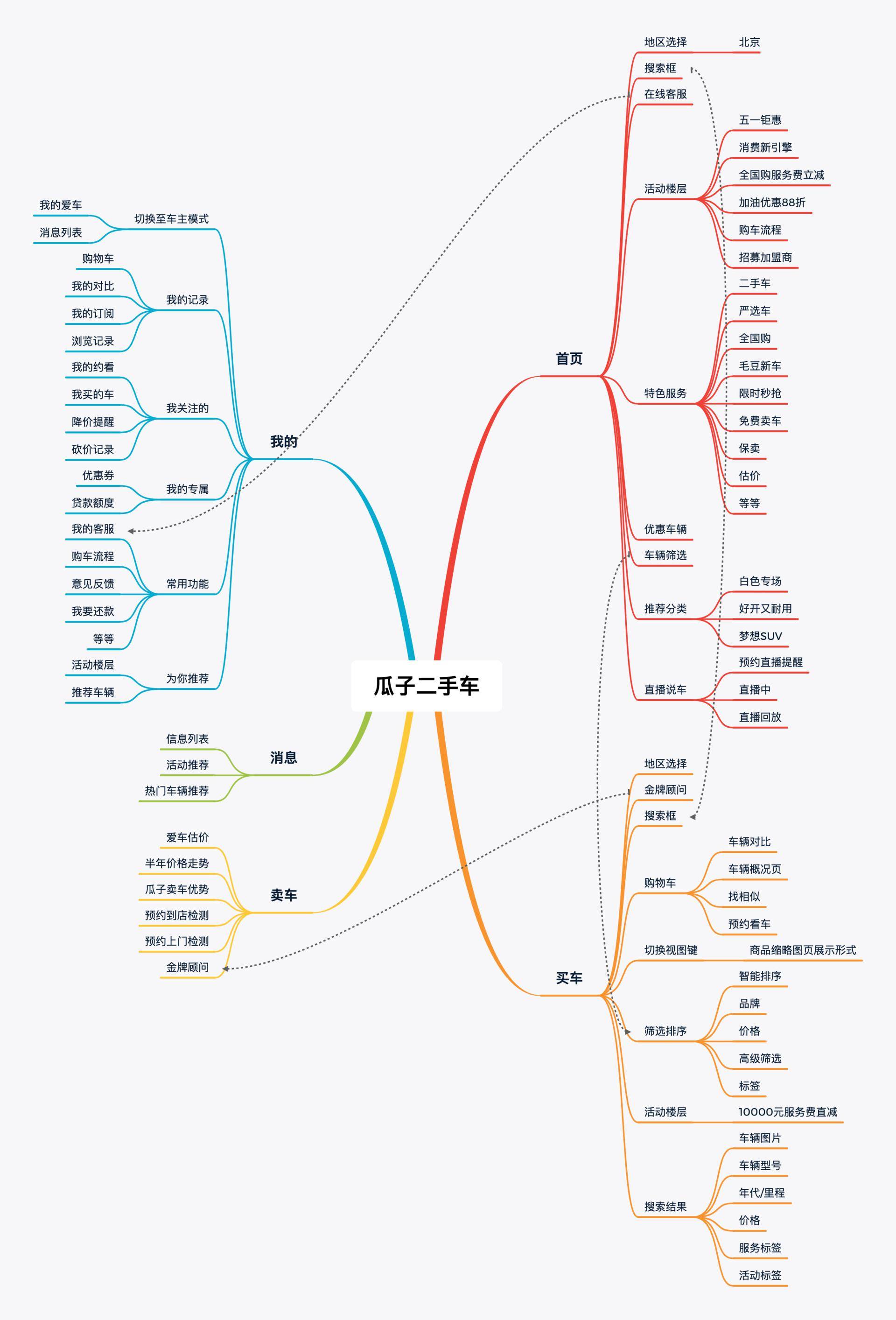 一级分支的买车页/卖车页直接区分了不同用户的使用路径。首页设置常用功能的入口,这些功能直接链接到买车/卖车页,也是用户转化路径的体现。在功能分布上,更多的功能是为买家提供,也是帮助买家选择,加速决策的设计。