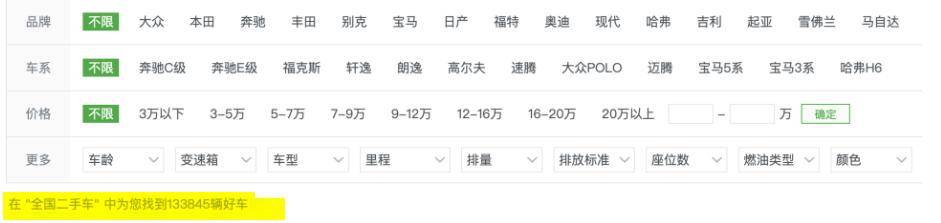 看车时,买家希望可以看到在自己钱包支持下有更多的选择,买车页提供价位区间,地区,品牌,车型,车龄,里程等等一系列筛选条件。还有严选好车,全国低价,准新车等服务模式筛选,让买二手车看起来就像网购一样简单。