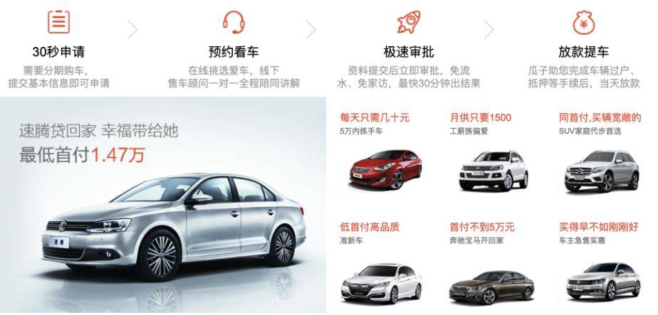 购买二手车行为,除了主观上置换习惯的转变,最大的客观因素就是预算不足的问题。瓜子金融服务,从源头上帮助顾客解决预算问题。用户在置换车辆时,一次性支出会限制用户的选择。瓜子金融,提供五十余种方案,可以选择比计划高一档的车;远比租车费用低的月供,让用户更容易接受金融方案买车,比起全款买二手车,最直接的提高了用户的单次消费金额。