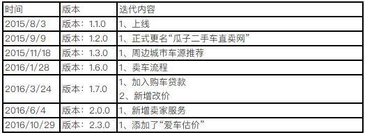 瓜子二手车前身是赶集好车。在2015年8月前,瓜子就内测了V1.0.0,主要把车源展示在移动端。第一个发布的版本1.1.0,实现了网页的基本功能。