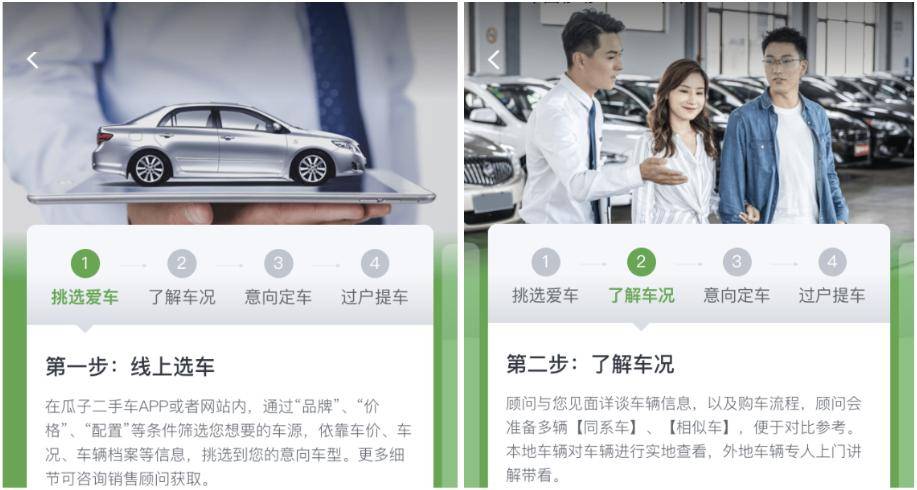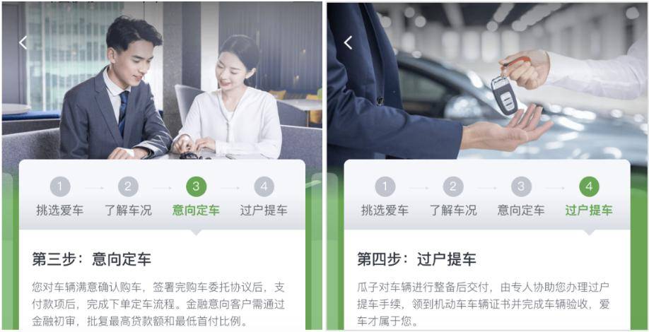 瓜子一站式服务,简洁的购车步骤,专业的服务顾问,瓜子买车4步法打造良好的用户体验提升转化率。