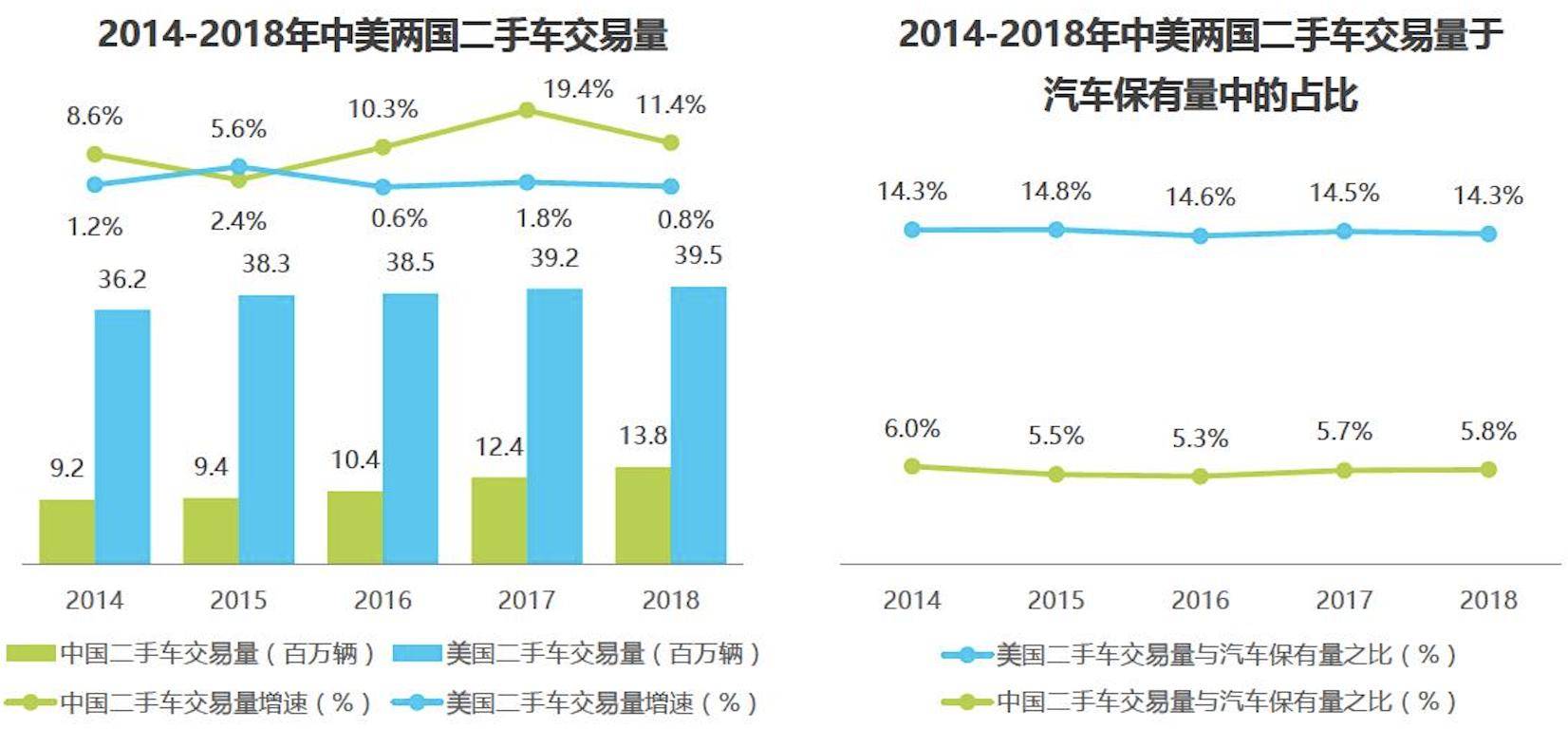 2018年,美国新车与二手车交易比1:2.3,中国尚不足1:0.5。且二手车交易量与汽车保有量之比美国稳定在14%以上,中国仅5.8%,中国二手车平均流转次数和美国也有很大差距,中国的二手车市场仍然潜力巨大。