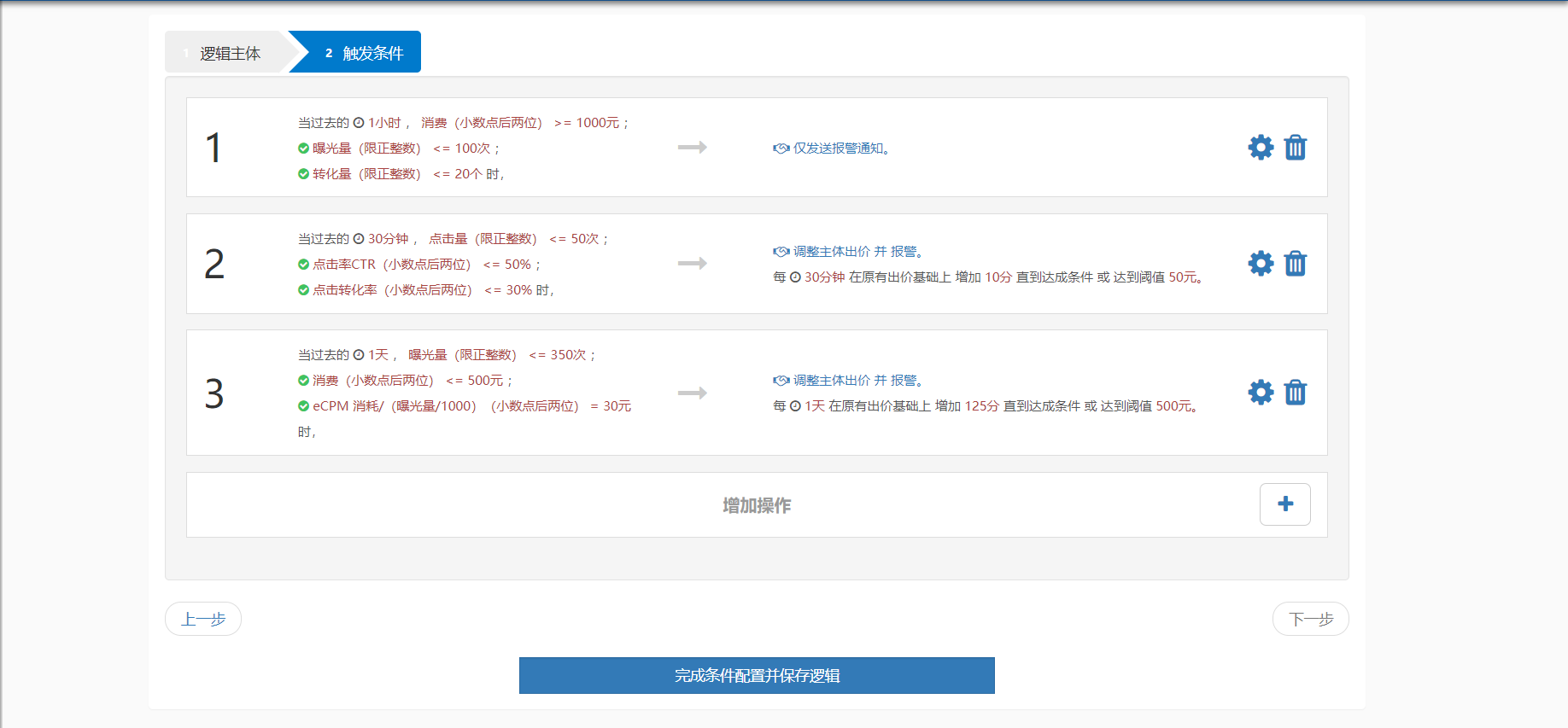 数透数据监控的作用是通过设定的规则条件当账户或者投放组或计划出现异于规定条件时,第一时间发短信和微信消息推送给操作人员。可以设置多种规则,如CPC1.6元(单个规则)、花费50000元且CPC1.9元(多个规则),进行自动监控。开启功能后,当设定条件发生变化时,系统根据提前设置的条件进行发送预警通知或进行修改出价等操作。