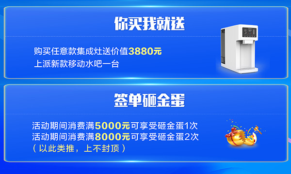 搞事搞事!6月12日6月27日,集成灶十大品牌、净水器十大品牌、模块化集成灶领跑者全国联动,618年终钜惠火爆来袭,用更低的价格,享受更好的品质,我们的目的只有一个,为您省钱!省钱!省钱!只要你来,我们定不负你所望,你要的特价,给!你要的礼品,送!多重好礼,强势来袭!进店扫码即可领取红包一个,另外,F16集成灶+X601集成水槽(超值套餐)原价17980元,直击裸价只要9800元!单品X601集成水槽原价6180元直击裸价只要2999元,购买任意款集成灶送价值3880元上派新款移动水吧一台,活动期间消费满5000元可享受砸金蛋1次,消费满8000元可享受砸金蛋2次(以此类推,上不封顶)!