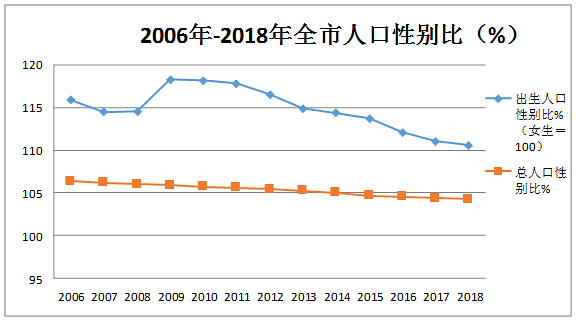 2018年总人口性别比为104.29,出生人口性别比为110.58,出生人口中男性出生34012人,女性出生30757人,比上年下降0.45%。近年来全市出生性别比按每年1%左右稳步下降趋势。