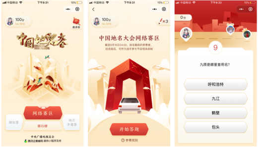 为了让全民体验“地名”之美,感受“地名”之趣,《中国地名大会》主办方联合腾讯企鹅辅导推出了地名答题的网络赛区玩法。网友进入《中国地名大会》小程序后,可以通过在线答题的形式参与《中国地名大会》网络预选赛选拔。小程序内设与中国地名相关的海量题库,让网友们在节目开播前就提前领略“地名”背后的历史故事和文化魅力,据小程序公告显示,9月下旬还将开放锦标赛和地区争霸赛,网友将有机会参与地名花式玩法。