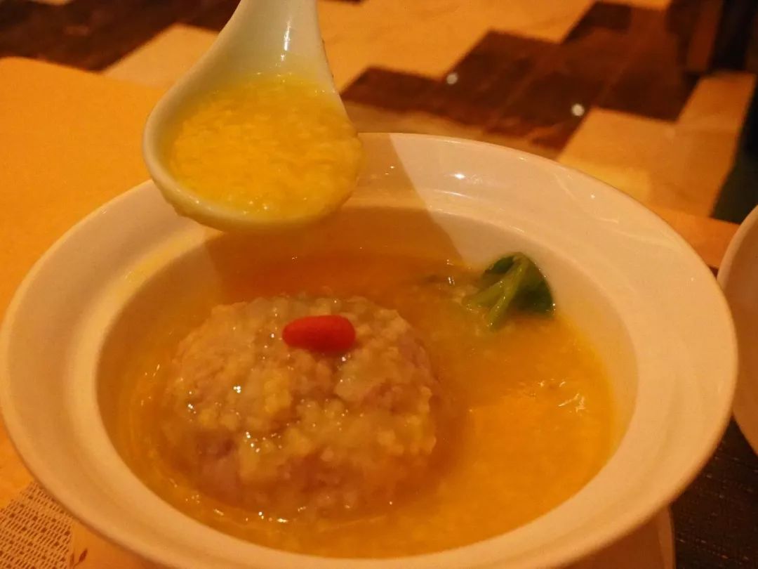 肥三瘦七的比例精选的精五花肉,切成小粒,把马蹄也切成小粒,然后糅合起来,加一点咸盐一直摔打摔打,直到把肉的胶性打出来,再用猪棒骨、老鸡、精华火腿等熬制四五个小时的高汤煮熟。这个小米煮狮子头,小编是第一次吃呢,也是乐厨马师傅的独创。马师傅说了,有人吃了狮子头会觉得腻,而小米有吸油的作用又很滋补,所以他就加了小米熬制,既养生健康,也减轻了腻的感觉。这一碗浓香的米粥汤,再加上肥瘦相间的狮子头小肉粒里面马蹄颗粒的碰撞,让人吃到停不下来,瞬间就能吃完一碗。酒精小火炉一直在保着温,咕嘟咕嘟,好适合在初冷的季节吃。