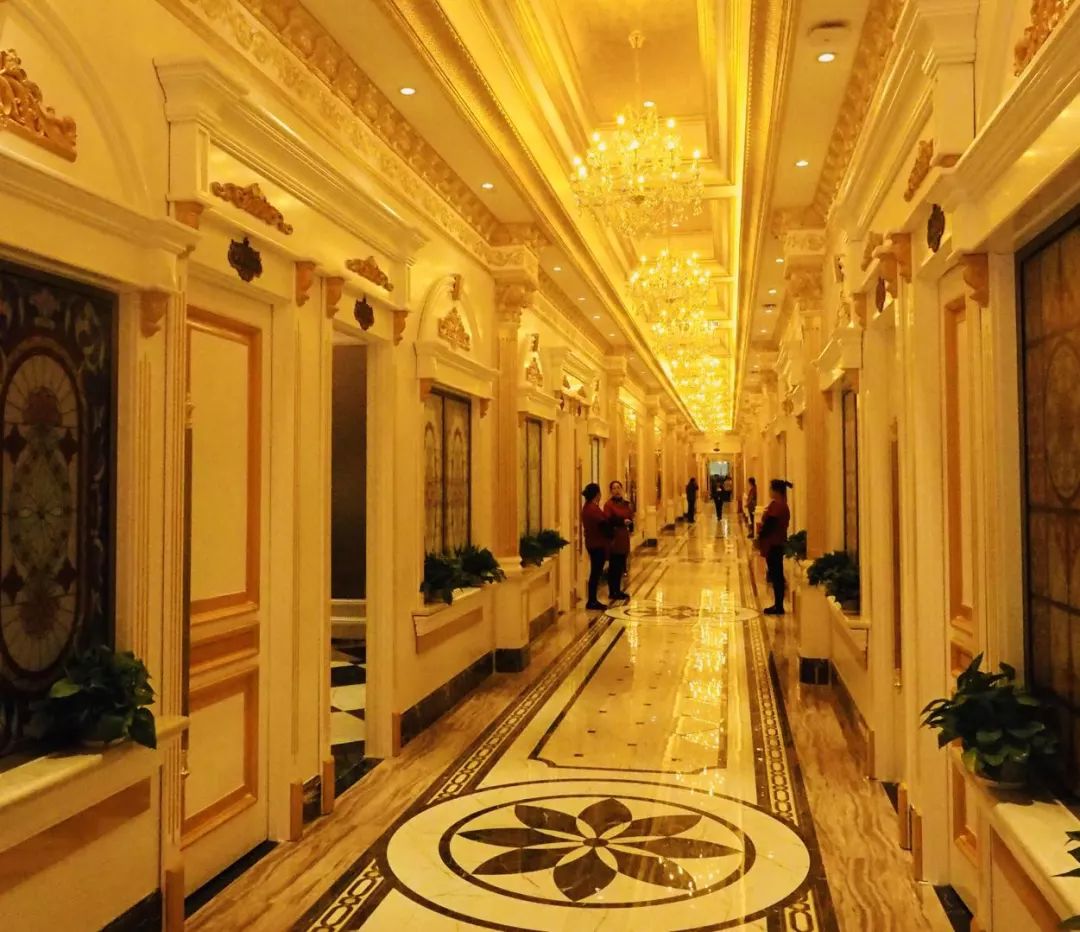 往里走,这是进雅间和宴会厅必经的一条走廊,长长的通道老气派了,金碧辉煌的。这等富丽堂皇的装修,请人吃饭来这里,简直不要太有面子呀。