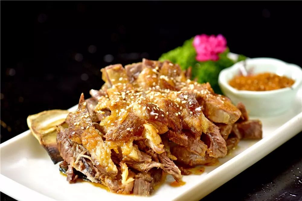 烤羊铲是个什么好吃的?这可是乐厨大师傅马利军的独创。马师傅说,有时候两三个人来吃饭想吃个烤肉,点羊排的线一份,俩人吃不了太浪费,那就可以点这个78一份的烤羊铲了。羊铲板就是腿跟身体连接的部位,肌肉发达,烤熟以后的口感又瘦又嫩。烤羊铲的做法也是先腌制再烤,烤完后蘸秘制的干料,除了椒盐、孜然、辣椒粉、芝麻面等大众蘸料,马师傅奇思妙想地加入了内蒙本地特产——炒熟的胡麻面,蘸着吃那叫一个香。