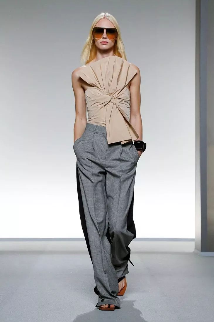 西装剪裁不再是过去几季流行的超大廓形,线条依旧硬朗但更为流畅,硬挺的面料在拉长的整体比例上,营造出一个纤细而富有力量感的形象。