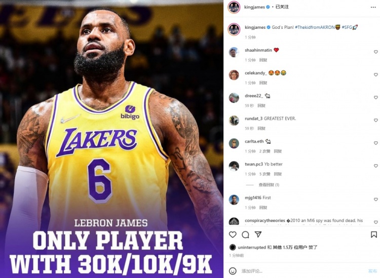 1月21日讯 昨日湖人不敌步行者,詹姆斯全场摘下12个篮板,成为了NBA历史上首位得到3万分+1万板+9千助的球员。