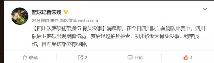 微博原文如下:“【四川队韩硕韧带损伤骨头没事】消息源,在今日四川队与首钢队比赛中,四川队后卫韩硕出现崴脚伤病,赛后经过拍片检查,初步诊断为骨头没事,韧带损伤。目前受伤部位有些肿。”