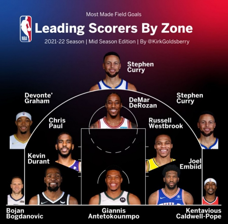 1月19日讯 今日,数据专家Kirk Goldsberry盘点了赛季至今各个区域的得分王。